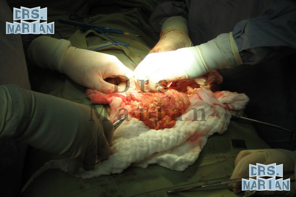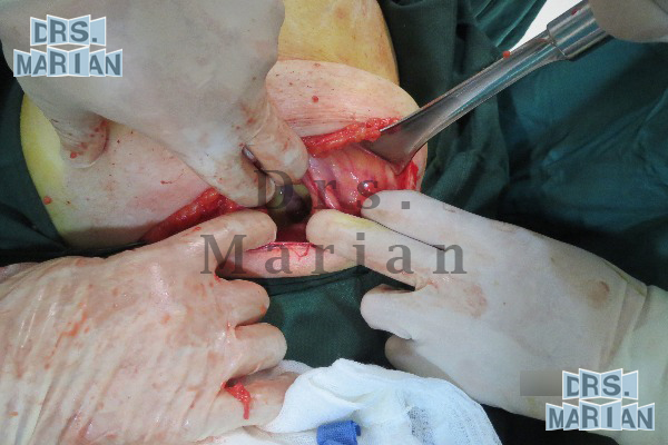 Depending on the size of the hernia sac, the base is cut or reversed, and instead a PerFix cap is placed, and subsequently mesh reinforcement is placed over the inguinal floor, set with the same material.