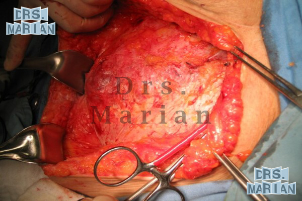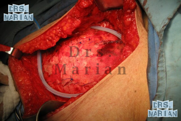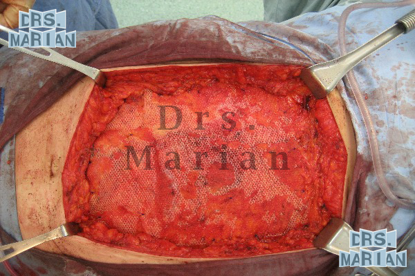 Depends on the location, size and anatomical elements involved, it is usually a muscular and wall reconstruction that will give us a visceral protection, placing mesh fixed to a firm structure, free of tension at a distance of 1.2 to 2 inches to the edge of the hernial ring with no wrinkles or creases, it may require the application of a subcutaneous closed drainage.