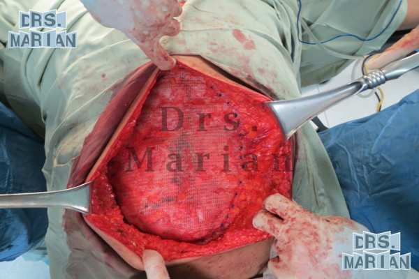 Dependerá de la localización, tamaño y los elementos anatómicos involucrados, por lo general es la reconstrucción muscular y parietal que nos dará una protección visceral, colocando malla de polipropileno fijando a estructuras firmes, libre de tensión a una distancia al borde del anillo herniario de 3 a 5 cms., sin arrugas o pliegues, pudiendo requerir la aplicación de un drenaje subcutáneo cerrado.